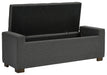 | Details | Polyester upholstery in gray, Wood legs with brown finish, Tufted seat cushion, Hinged seat, Interior storage | |