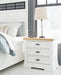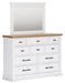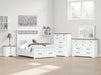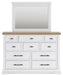 Details B844B2: Includes panel headboard, storage footboard, rails and roll slats, Footboard made with hardwood solids, MDF substrates and butcher block oak veneer, Headboard and rails made with hardwood solids and MDF substrates, White finish, Headboard with inset black metal barn sash, 2 drawers in footboard with fully finished interior, dovetail construction and ball-bearing side glides, Pulls with matte black finish, Bed does not require a foundation/box spring, Mattress available, sold separately, Assembly required, B844B1: Includes dresser and mirror, Made with hardwood solids, MDF substrates and butcher block oak veneer, Dresser with 2-tone finish (white finish; butcher block oak veneer with natural finish), Pulls with matte black finish, 10 spacious drawers with fully finished interiors (top drawers felt lined), dovetail construction and ball-bearing side glides , Drawers with inset picture fronts, Mirror attaches to back of dresser, B844-46: Made with hardwood solids, MDF substrates and butcher block oak veneer, 2-tone finish (white finish; butcher block oak veneer with natural finish), Pulls with matte black finish, 5 spacious drawers with fully finished interiors (top drawers felt lined), dovetail construction and ball-bearing side glides, Drawers with inset picture frame fronts, B844-93: Made with hardwood solids, MDF substrates and butcher block oak veneer, 2-tone finish (white finish; butcher block oak veneer with natural finish), Pulls with matte black finish, 3 spacious drawers with fully finished interiors (top drawers felt lined), dovetail construction and ball-bearing side glides, 110V power supply with dual USB charging ports, Power cord included; UL Listed, Drawers with inset picture frame fronts,