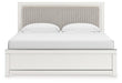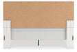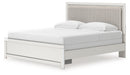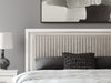 | Details | Includes upholstered panel headboard, panel footboard and panel rails , Made with engineered wood (MDF/particleboard/plywood) and decorative laminate for the right balance of affordability and durability , Matte white finish with subtle replicated wood grain, Decorative laminate replicates natural or man-made material surfaces with consistent color, pattern and texture , Polyester upholstery , Chrome-tone and glitter accents, Foundation/box spring required, sold separately, Mattress available, sold separately, Minor assembly required | |
