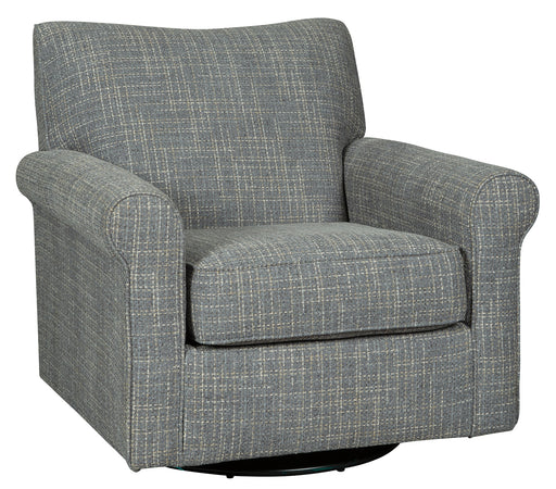 Signature Design by Ashley®Sporting a tantalizing tweed weave fabric in such a soothing blue hue, this swivel glider accent chair gives the classic roll arm chair a modern tw...