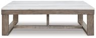 This coffee table is simple in design but big on style. Finished with a trend-right grayish brown wood tone, its bold, blocky profile and natural marble top are timeless classic choices that work so well with large sectional family room settings. Adding to its beauty, the marble top's color variations, fissures, mineral deposits and veining are naturally formed and are not defects.