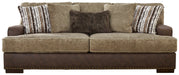 Details Corner-blocked frame, Loose seat and back cushions, High-resiliency foam cushions wrapped in poly fiber, Polyester interior upholstery and faux leather exterior upholstery, Throw pillows included, Pillows with feather-fiber fill, Bronze-tone nailhead trim, Platform foundation system resists sagging 3x better than spring system after 20,000 testing cycles by providing more even support, Smooth platform foundation maintains tight, wrinkle-free look without dips or sags that can occur over time with sinuous spring foundations