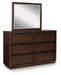 Details PCB857B7: Includes canopy, upholstered headboard, footboard, rails, posts and slats, Made with hardwood solids, mango wood veneer and MDF substrates , Side rails feature laminated solid hardwood slat support rails (or LVL) with glued and screwed blocking for added strength, Complex, rich dark brown finish, Foam headboard cushion with polyester upholstery , Measure room, including ceiling height, to ensure bed clears fans and light fixtures, Foundation/box spring required, sold separately , Mattress available, sold separately , USB-A and USB-C charging ports, Power cord included; UL Listed, Assembly required, PCB857B1: Made with hardwood solids, mango wood veneer and MDF substrates , Complex, rich dark brown finish, Full-length metal rail pulls with matte black finish, 6 smooth-gliding drawers with fully finished interiors, dovetail construction and heavy-duty ball-bearing side glides (top drawers felt lined), Mirror attaches to back of dresser, Soft rounded pilasters, Raised plinth base,