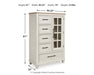 Details B683B7: Includes panel headboard, footboard, rails and slats, Made with hardwood solids, veneers and MDF substrates, Two-tone finish (antiqued white and light gray wood tone), Foundation/box spring required, sold separately, Mattress available, sold separately, Assembly required, B683B1: Includes dresser and mirror, Made with hardwood solids, veneers and MDF substrates, Two-tone finish (antiqued white and light gray wood tone), Dark bronze-tone bar pulls, 2 glass-front cabinets, each with single storage shelf, 5 drawers with fully finished interior, dovetail construction and heavy duty ball-bearing side glides (top drawer felt lined), Mirror attaches to back of dresser, B683-48: Made with hardwood solids, veneers and MDF substrates, Two-tone finish (antiqued white and light gray wood tone), Dark rustic bar pulls, Glass-front cabinet with 3 adjustable shelves, Door includes interchangeable wood veneer panel (ships with glass panel installed), 5 drawers with fully finished interior, dovetail construction and heavy duty ball-bearing side glides (top drawer felt lined),
