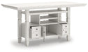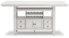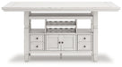 Details | D642D7: Includes dining table top and base, Made with rubberwood solids, ash veneer and MDF substrates, Antiqued white finish with wood grain texture, Two 10-bottle wine storage shelves (1 reversible), Lower door cabinet accessible from both sides, 2 pass-through drawer bins, Assembly required, D642-124: Made with wood, Antiqued white finish with wood grain texture, Foam cushion with polyester upholstery, Nailhead trim, X-back, Assembly required, | |