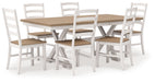 Details | PCD627-35: Made with hardwood solids, mango wood veneer and MDF substrate, Top with light butcher block oak veneer, Frame with antiqued white finish, Self-storing butterfly leaf, Assembly required, PCD627-01: Made with solid wood frame, Seat with light butcher block oak veneer, Frame with antiqued white finish, Ladderback design, Contoured seat for added comfort, Assembly required, | |