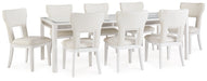 Details | D822-35: Made with solid wood components, MDF substrate and decorative PVC laminate, Bright white lacquer finish, Tabletops feature rhinestone and textured PVC framing with glass panels, Rhinestone accent trim, Seats up to 10, Removable center leaf, Table extends by pulling both ends and dropping in leaf, Assembly required, D822-01: Made with solid wood frame, Bright white lacquer finish, Polyester upholstery, Foam cushion, Legs with adjustable levelers, Assembly required, | |