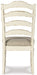 Details | D743-45: Made of veneers, wood and engineered wood with some cast resin components, Antiqued two-tone finish, Separate extension leaf, Table extends by pulling both ends and dropping in leaf, Seats up to 8, Assembly required, D743-01: Made with wood and engineered wood, Distressed, chipped white finish, Ladderback styling, Polyester upholstery over foam cushioned seat, Assembly required, D743-02: Made with wood and engineered wood, Distressed, chipped white finish, Stylized ribbon back design, Polyester upholstery over foam cushioned seat, Assembly required, | |