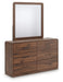 Details | Includes dresser and mirror, Made with MDF substrates and decorative paper laminate, Replicated walnut wood grain with high-low contrast for a rich brown wood tone, Hardware with black finish, 6 smooth-gliding drawers with English dovetail construction and center mount drawer guides (top drawers felt lined), Drawer interiors lined with decorative wood grain paper laminate, Mirror attaches to back of dresser | |