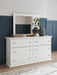 Details | B139B42: Includes panel headboard/footboard and rails, Made with engineered wood (MDF/particleboard/plywood) and decorative laminate for the right balance of affordability and durability, Replicated solid white paint, Decorative laminate replicates natural or man-made material surfaces with consistent color, pattern and texture, Foundation/box spring required, sold separately, Mattress available, sold separately, Assembly required, B139B40: Includes dresser and mirror, Made of engineered wood (MDF/particleboard), Knobs with pewter-tone finish, Scalloped moulding, 6 smooth-operating drawers, Includes tipover restraint device, Mirror attaches to back of dresser; can also be mounted on wall horizontally or vertically, Safety is a top priority, clothing storage units are designed to meet the most current standard for stability, ASTM F 2057 (ASTM International), Drawers extend out to accommodate maximum access to drawer interior while maintaining safety, | |