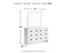 Details | B427B4: Includes full panel headboard, footboard, rails and slats, Made with hardwood solids, okoume veneer and MDF substrates, White finish, Foundation/box spring required, sold separately, Mattress available, sold separately, Assembly required, B427B1: Includes dresser and mirror, Made with hardwood solids, okoume veneer and MDF substrates, White finish, 6 drawers with dovetail construction and metal center guides, Hardware with dark finish, Drawer interiors are lined with a wood grain laminate for a clean, finished look, Mirror attaches to back of dresser, B427-46: Made with hardwood solids, okoume veneer and MDF substrates, White finish, 5 drawers with dovetail construction and metal center guides, Hardware with dark finish, Drawer interiors are lined with a wood grain laminate for a clean, finished look, | |