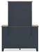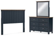 Details | B414-87: Made with hardwood solids, mindi wood veneer and MDF substrates, Two-tone finish features a dark slate blue with a light brown wood-tone top, ¼" bolts (not included) are needed to attach headboard to your existing bed frame, Assembly required, B414B1: Includes dresser and mirror, Made with hardwood solids, mindi wood veneer and MDF substrates, Two-tone finish features a dark slate blue with light brown wood-tone top, Nickel-tone metal knobs, 6 drawers with fully finished interior, dovetail construction and heavy duty ball-bearing side glides, Mirror attaches to back of dresser, | |