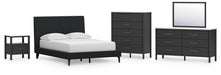 Cadmori Full Upholstered Bed with Mirrored Dresser, Chest and Nightstand