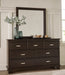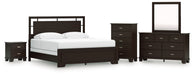 Details | B441B8: Includes panel headboard, footboard, rails and slats, Made with hardwood solids, engineered wood veneer and MDF substrates, Dark brown finish, Floating panel headboard, Picture frame footboard, Foundation/box spring required, sold separately , Mattress available, sold separately, Assembly required, B441B1: Includes dresser and mirror, Made with hardwood solids, engineered wood veneer and MDF substrates, Dark brown finish, Metal bar pulls with bright nickel-tone finish, 7 smooth-gliding drawers with dovetail construction and metal center guides, Drawer interiors are lined with a wood grain laminate for a clean, finished look, Top moulding on dresser, Mirror attaches to back of dresser, B441-46: Made with hardwood solids, engineered wood veneer and MDF substrates, Dark brown finish, Metal bar pulls with bright nickel-tone finish, 5 smooth-gliding drawers with dovetail construction and metal center guides, Drawer interiors are lined with a wood grain laminate for a clean, finished look, Top moulding, B441-92: Made with hardwood solids, engineered wood veneer and MDF substrates, Dark brown finish, Metal bar pulls with bright nickel-tone finish, 2 smooth-gliding drawers with dovetail construction and metal center guides, Drawer interiors are lined with a wood grain laminate for a clean, finished look, Top moulding, | |