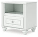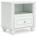 | Details | Made with engineered wood (MDF/particleboard/plywood) and decorative laminate for the right balance of affordability and durability, Matte white finish, Decorative laminate replicates natural or man-made material surfaces with consistent color, pattern and texture, Crystal drawer knob, 1 smooth-operating drawer, Drawer interior is lined with a faux linen laminate for a clean, finished look, Open shelf, USB-A and USB-C charging ports, Pink, purple and white LED lighting options; touch button control, Power cord included; UL Listed, Minor assembly required | |