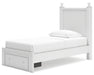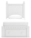 Make morning or bedtime that much more magical with this twin panel storage bed. Charmingly cute with its scalloped detailing, it appeals to both her sense of playful whimsy and your love for modern design. Drawers in the footboard provide handy storage for clothes, toys and anything in between. And the bed's crisp white finish gives you the versatility to pair it with existing decor.