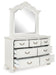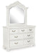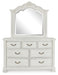 | Details | Includes dresser and mirror, Made with hardwood solids, veneer and MDF substrate with cast resin components , Antiqued white finish, Metal pulls with polished pewter-tone finish , 7 smooth-gliding drawers with fully finished interiors, French/English dovetail construction and heavy-duty ball-bearing side glides (top drawers felt lined), Thick decorative moulding, Mirror attaches to back of dresser | |