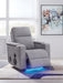 Details One-touch remote control with adjustable positions, Easy View™ adjustable headrest, power lumbar support, LED lighting on/off and auto glide, Corner-blocked frame with metal reinforced seat, Attached cushions; high-quality foam cushions wrapped in poly fiber, Polyester upholstery; Next-Gen Nuvella™ is a family-friendly fabric that is soft, easy to clean, stain resistant and durable, Clean fabric with mild soap and water, let air dry; for stubborn stains, use a solution of 4 oz. bleach to 28 oz. water, Built-in premium quality audio sound system with wireless connectivity and sonic bass in the seat, Armrests with flip-top storage; hidden Thunder control panel with adjustable volume, treble, bass and vibration, Heat in the seat element (with automatic 30-minute shutoff feature), Air massage system includes 3 settings: steady, pulse and wave (with automatic 20-minute shutoff feature), Power glide feature with three levels: slow, medium and fast, Ambient blue LED lighting on base for theater-style experience, Power cord included; UL Listed