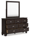 Details | B441B6: Includes panel headboard, footboard, rails and slats, Made with hardwood solids, engineered wood veneer and MDF substrates, Dark brown finish, Floating panel headboard, Picture frame footboard, Foundation/box spring required, sold separately , Mattress available, sold separately, Assembly required, B441B1: Includes dresser and mirror, Made with hardwood solids, engineered wood veneer and MDF substrates, Dark brown finish, Metal bar pulls with bright nickel-tone finish, 7 smooth-gliding drawers with dovetail construction and metal center guides, Drawer interiors are lined with a wood grain laminate for a clean, finished look, Top moulding on dresser, Mirror attaches to back of dresser, B441-46: Made with hardwood solids, engineered wood veneer and MDF substrates, Dark brown finish, Metal bar pulls with bright nickel-tone finish, 5 smooth-gliding drawers with dovetail construction and metal center guides, Drawer interiors are lined with a wood grain laminate for a clean, finished look, Top moulding, B441-92: Made with hardwood solids, engineered wood veneer and MDF substrates, Dark brown finish, Metal bar pulls with bright nickel-tone finish, 2 smooth-gliding drawers with dovetail construction and metal center guides, Drawer interiors are lined with a wood grain laminate for a clean, finished look, Top moulding, | |