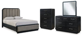 Details | B821B2: Includes upholstered panel headboard, footboard and rails , Made with hardwood solids and ash veneer, Black finish on textured wood grain surface , Waterfall edges, Polyester upholstery, Foundation/box spring required, sold separately, Mattress available, sold separately, Assembly required, B821B1: Includes dresser and mirror, Made with hardwood solids and ash veneer, Black finish on textured wood grain surface , Burnished nickel-tone pulls, Waterfall edges, 7 smooth-gliding drawers with fully finished interior, dovetail construction and heavy duty ball-bearing side glides, Mirror attaches to back of dresser, B821-46: Made with hardwood solids and ash veneer, Black finish on textured wood grain surface, Burnished nickel-tone pulls, Waterfall edges, 5 smooth-gliding drawers with fully finished interior, dovetail construction and heavy duty ball-bearing side glides, | |