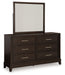 Details | B618B2: Includes upholstered panel headboard, panel rails and panel footboard with slats, Made with hardwood solids, engineered wood and MDF substrates, Grayish brown wood-tone finish, Floating inset upholstered panel in polyester Next-Gen Nuvella fabric surrounded by LED backlight, Next-Gen Nuvella™ is a performance fabric that is soft, easy to clean, stain-resistant and durable, Clean fabric with mild soap and water, let air dry; for stubborn stains, use a solution of 4 oz. bleach to 28 oz. water, Light switch is located on each side of headboard and includes dual USB charging port (USB-A and USB-C), Power cord included; UL Listed, Foundation/box spring required, sold separately, Mattress available, sold separately, Assembly required, B618B1: Includes dresser and mirror, Made with hardwood solids, engineered wood and MDF substrates, Grayish brown wood-tone finish, Metal bar pulls with satin nickel-tone finish, 6 smooth-gliding drawers with dovetail construction and heavy duty ball-bearing side glides (top drawers felt lined), Mirror attaches to back of dresser, B618-46: Made with hardwood solids, engineered wood and MDF substrates, Grayish brown wood-tone finish, Metal bar pulls with satin nickel-tone finish, 5 smooth-gliding drawers with dovetail construction and heavy duty ball-bearing side glides (top drawers felt lined), | |