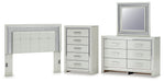 Zyniden Queen Upholstered Panel Headboard with Mirrored Dresser and Chest