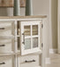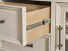 Details | Includes dresser and mirror, Made with hardwood solids, veneers and MDF substrates, Two-tone finish (antiqued white and light gray wood tone), Dark bronze-tone bar pulls, 2 glass-front cabinets, each with single storage shelf, 5 drawers with fully finished interior, dovetail construction and heavy duty ball-bearing side glides (top drawer felt lined), Mirror attaches to back of dresser | |