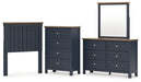 Details | B414-53: Made with hardwood solids, mindi wood veneer and MDF substrates, Two-tone finish features a dark slate blue with a light brown wood-tone top, ¼" bolts (not included) are needed to attach headboard to your existing bed frame, Assembly required, B414B1: Includes dresser and mirror, Made with hardwood solids, mindi wood veneer and MDF substrates, Two-tone finish features a dark slate blue with light brown wood-tone top, Nickel-tone metal knobs, 6 drawers with fully finished interior, dovetail construction and heavy duty ball-bearing side glides, Mirror attaches to back of dresser, B414-45: Made with hardwood solids, mindi wood veneer and MDF substrates, Two-tone finish features a dark slate blue with a light brown wood-tone top, Nickel-tone metal knobs, 4 drawers with fully finished interior, dovetail construction and heavy duty ball-bearing side glides, | |