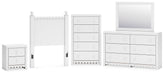 Details | B2540-53: Made with engineered wood (MDF/particleboard/plywood) and decorative laminate for the right balance of affordability and durability, Matte white finish, Decorative laminate replicates natural or man-made material surfaces with consistent color, pattern and texture, ¼" bolts (not included) are needed to attach headboard to your existing bed frame, Minor assembly required, B2540-46: Made with engineered wood (MDF/particleboard/plywood) and decorative laminate for the right balance of affordability and durability, Matte white finish, Decorative laminate replicates natural or man-made material surfaces with consistent color, pattern and texture, Simple white knobs, 5 smooth-gliding drawers, Drawer interiors are lined with a faux linen laminate for a clean, finished look, Safety is a top priority, clothing storage units are designed to meet the most current standard for stability, ASTM F 2057 (ASTM International), Drawers extend out to accommodate maximum access to drawer interior while maintaining safety, Minor assembly required, B2540-92: Made with engineered wood (MDF/particleboard/plywood) and decorative laminate for the right balance of affordability and durability, Matte white finish, Decorative laminate replicates natural or man-made material surfaces with consistent color, pattern and texture, Simple white knobs, 2 smooth-gliding drawers, Drawer interiors are lined with a faux linen laminate for a clean, finished look, 2 slim-profile USB charging ports, Power cord included; UL Listed, Minor assembly required, B2540B1: Includes dresser and mirror , Made with engineered wood (MDF/particleboard/plywood) and decorative laminate for the right balance of affordability and durability, Matte white finish, Decorative laminate replicates natural or man-made material surfaces with consistent color, pattern and texture, Simple white knobs, 6 smooth-gliding drawers, Drawer interiors are lined with a faux linen laminate for a clean, finished look, Mirror can be attached to back of dresser or wall mounted horizontally or vertically, Safety is a top priority, clothing storage units are designed to meet the most current standard for stability, ASTM F 2057 (ASTM International) , Drawers extend out to accommodate maximum access to drawer interior while maintaining safety, Minor assembly required, | |