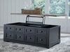 Raise the bar on modern farmhouse style with this lift-top coffee table. Its sturdy silhouette and casual good looks are accentuated with a two-tone finish, which pairs a warm satin black base with a contrasting butcher block veneer top. Combining form and function, its lift top extends for a casual dinner or extra work space in front of your sofa. Two spacious lower drawers and handy storage bins under the top make this piece awfully useful, too. Whether your style is vintage, country or eclectic, this table adds a hearty element.