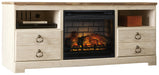 Details Includes TV stand and electric infrared fireplace insert (W100-101), Made with engineered wood (MDF/particleboard) and decorative laminate, Replicated whitewash and wood grained block pattern with authentic touch, Antiqued brass-tone hardware, 2 drawers, 2 media cubbies, cutouts for wire management and adjustable/removable center shelf, Electric fireplace insert provides up to 5,386 BTU/1,500W and warms up to 1,000 square feet (heats larger rooms), 7-level temperature setting; 5 levels of flame brightness, LED-lit multi flame display operates with or without infrared heat, Realistic-looking log set with dynamic glowing embers, Remote control with LED display, Timer function with programmable ranges from 10 minutes to 9 hours; overheating control device, Power cord included; UL Listed, Assembly required; simply remove the center shelf and back panel to make room for the fireplace insert