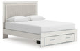 Details | Includes upholstered panel headboard, storage footboard, roll slats and platform rails , Made with engineered wood (MDF/particleboard/plywood) and decorative laminate for the right balance of affordability and durability , Matte white finish with subtle replicated wood grain, Decorative laminate replicates natural or man-made material surfaces with consistent color, pattern and texture , Polyester upholstery , Chrome-tone and glitter accents, Large-scale chrome-tone handles with faceted details, 2 smooth-gliding drawers , Drawer interiors are lined with a faux linen laminate for a clean, finished look , Bed does not require additional foundation/box spring; accommodates most zero clearance adjustable bases with the addition of a bunkie board, Mattress available, sold separately, Minor assembly required | |